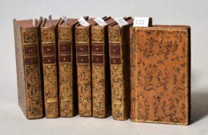 VERTOT (René Aubert, abbé de). Histoire des chevaliers hospitaliers de S. Jean de Jérusalem, appellés […] chevaliers de Malthe. A Paris, Chez Delalain, 1772 (t. I à V) et à Paris, Aux Dépens de la Compagnie des Libraires Associés, 1771 (t. VI et VII). 7 volumes in-12, veau, triple filet doré encadrant les plats, dos lisse orné avec armoiries en pied (Bisiaux ?). « Nouvelle Edition augmentée des Statuts de l’Ordre, & des noms des Chevaliers. » Trois coiffes de tête accidentées ; premier mors du tome II fendu sur deux centimètres ; rousseurs et piqures. EXEMPLAIRE aux ARMES de Guillaume ou Jean-Baptiste du BARRY, beau-frère de la favorite de Louis XV.