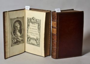 [VIRGILE]. L’Eneide di Virgilio del Commendatore Annibal Caro. In Parigi, Presso la Vedova Quillau, 1760. 2 volumes in-8°, maroquin rouge, triple filet doré encadrant les plats, dos à nerfs orné, pièces de titre et de tomaison en maroquin fauve, tranches dorées (reliure de l’époque). Deux portraits de Virgile et d’Annibal Caro en frontispice, deux titres ornés, onze planches, bandeaux et culs-de-lampe gravés d’après Giuseppe ZOCCHI. Coiffe de tête du tome I habilement restaurée.