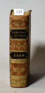 [ALMANACH ROYAL]. Almanach royal, pour l’année bissextile M. DCCC. XXIV. Paris, Chez A. Guyot et Scribe, s. d. [1824]. In-8°, demi-basane, dos lisse orné de fleurs de lys, pièces de titre en maroquin brun (reliure de l’époque). Coiffes et mors frottés ; coins émoussés.