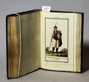 [ESPAGNE – COSTUMES / RODRIGUEZ (Antonio)]. [Colección General de los Trages que en la actualidad se usan en España (…)]. S.l.n.d. In-12, demi-chagrin vert, dos à nerfs orné tête dorée (reliure fin XIXe s.). 112 planches en couleurs gravées par Francisco de PAULA MARTI, José VAZQUEZ, Manuel ALBUERNE et Pedro Vicente RODRIGUEZ, d’après Antonio RODRIGUEZ, et aquarellées à la main. Second tirage, sans titre, de cette suite dont seize planches présentent des variantes. De la bibliothèque Émile Levavasseur, avec ex-libris.