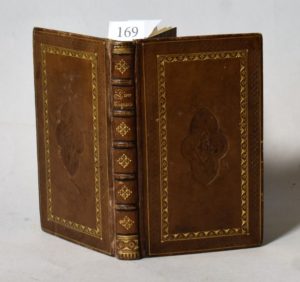 [MALO (Charles)]. Livre mignard ou la Fleur des fabliaux. Paris, Louis Janet, Libraire, s. d. [1826]. Petit in-12, veau brun, large encadrement de filets dorés et fines roulettes dentelées à froid et dorée ornant les plats, large fleuron losangé à froid au centre, dos à nerfs orné, tranches dorées (reliure de l’époque). Un titre-frontispice aquarellé et enluminé et six autres planches mises en couleurs ; culs-de-lampe. Un mors restauré. BEL EXEMPLAIRE.