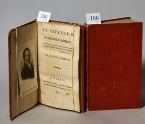 PIGAULT-LEBRUN (Guillaume Charles Antoine). Le Citateur. A Paris, Chez Barba, Libraire, 1803. 2 volumes in-12, bradel, cartonnage rouge, dos orné (reliure de l’époque). ÉDITION ORIGINALE. Un portrait de l’auteur contrecollé en frontispice. Ex-libris au timbre humide sur les titres ; rousseurs.