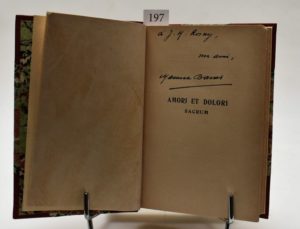 BARRÈS (Maurice). Amori et dolori sacrum. La Mort de Venise. Paris, Félix Juven, Éditeur, s. d. [1903]. In-8°, demi-buffle rouge à coins, dos à nerfs, couverture conservée (reliure fin XXe s.). Envoi de l’auteur sur le faux-titre : « à J. H. Rosny, // un ami, // Maurice Barres ». Quatre derniers feuillets perforés.