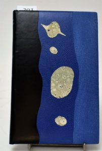 [BETTENCOURT (Pierre)]. CHAZAL (Malcolm de). Penser par étapes. Notes liminaires par J[ean] P[aulhan]. S. l., L’Air du Temps, n. d. [A Paris et à Port-Louis, Ile Maurice, 1949]. Petit in-8°, box noir à bandes ondulées mosaïquées de maroquins bleus ornant les plats, dos lisse, couverture conservée, boite-étui (M. F. Jordan). Tiré à 180 exemplaires sur Arches, celui-ci n° 84. Imbert, 32, 11.