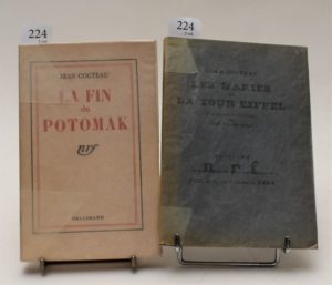 COCTEAU (Jean). La Fin du Potomak. Paris, Gallimard, s. d. [1940]. In-8 broché, couverture rempliée, non coupé. ÉDITION ORIGINALE. Un des 163 exemplaires du tirage de tête, celui-ci (n° VIII), UN DES DIX SUR JAPON IMPERIAL, après six sur chine. JOINT : COCTEAU. Les Mariés de la Tour Eiffel. Paris, NRF, 1924. Petit in-8°, broché. Portrait de l’auteur sur chine par Jean HUGO. Tiré à 1060 exemplaires, celui-ci (n° 293), un des 1035 sur vergé des papeteries Navarre. Ensemble deux volumes.