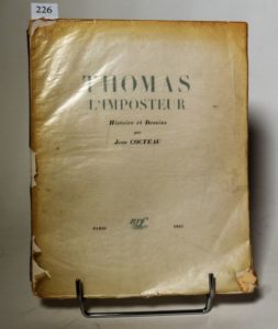 COCTEAU (Jean). Thomas l’imposteur. Paris, Nrf, 1927. In-4°, broché, couverture rempliée. Un frontispice en couleurs et nombreux bois dont certains à pleine page dans le texte, par Jean COCTEAU. Tiré à 372 exemplaires, celui-ci (n° 304), un des 320 sur vélin pur fil teinté Lafuma. Couverture défraichie avec petit accident en coins.