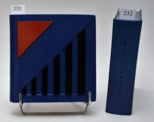 CROMBIE (John). Biobibliographie. S. l., Kickshaws, n. d. [Paris, 1986]. In-12 carré, buffle bleu, décor géométrique mosaïqué ornant les plats, dos lisse, pages de gardes en couleurs décorées de lettres peintes, couverture conservée, boite-étui (M. F. Jordan). Tiré à 60 exemplaires, celui-ci n° 25.