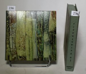 CROMBIE (John). In Parenthesis. S. l., Kickshaws, n. d. [Paris, 1992]. In-12 carré, box, dos lisse muet en maroquin turquoise, couverture illustrée conservée, boite-étui (reliure fin XXe s.). Illustrations en couleurs par John CROMBIE. Tiré à 65 exemplaires, celui-ci n° 15.