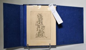 GOLL (Yvan). Le Mythe de la Roche Perçee. Poeme. Paris, Editions Hemispheres, s. d.[1947]. In-8°, veau bleu marbré avec premier plat en plexiglas, dos lisse muet, couverture conservée, boite-étui (reliure fin XXe s.). ÉDITION ORIGINALE. Trois eaux-fortes par Yves TANGUY. Tiré à 400 exemplaires, celui-ci (non numéroté), un des 100 sur papier à la cuve Shadowmould, contenant les trois eaux fortes originales et COMME LES TROIS DE TETE une quatrième planche tirée sur cuivre par Yves TANGUY.