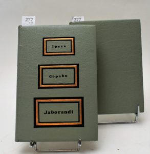 HÉMARD (Joseph). Formulaire magistral. Paris, René Kieffer, Relieur-Éditeur, s. d. [1927]. 2 volumes in-8° dont un pour les suites, maroquin vert amande, nom de plantes médicinales ou drogues dans des encadrements mosaïqués ornant les plats, dos lisse, couverture conservée, non rogné, chemise à rabats, étui commun (reliure fin XXe s.). Illustrations en couleurs dans le texte, par Joseph HÉMARD. Tiré à 895 exemplaires, celui-ci (n° 47), un des 50 sur japon avec une suite des illustrations et une aquarelle originale inédite n’ayant pas servi aux illustrations, par Joseph HÉMARD.