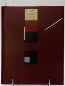 JACOB (Max). Méditations religieuses. S. l. [Paris], La Table Ronde, 1945. In-4°, box bordeaux, décor géométrique mosaïqué rouge et noir avec bandes ornant les plats, dos lisse muet, couverture conservée, chemise-étui (reliure fin XXe s.). Illustrations par Max JACOB, certaines réhaussées de couleurs. Tiré à 325 exemplaires, celui-ci (n° H. C. VI), un des 25 hors commerce.