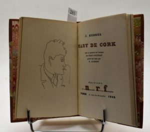 KESSEL (Joseph). Mary de Cork. Paris, Éditions de la Nouvelle Revue Française, 1925. In-12°, demi-maroquin beige à coins, dos à nerfs, couverture conservée (reliure fin XXe s.). ÉDITION ORIGINALE. Portrait de l’auteur en frontispice par Jean COCTEAU, gravé sur bois par G. AUBERT. Tiré à 1144 exemplaires, celui-ci (n° 352), un des 1000 sur vélin de Navarre.