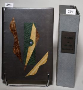 Le CLÉZIO (Jean-Marie Gustave). L’Extase matérielle. S. l., Gallimard, n. d. [Paris, 1967]. In-8°, box gris, décor mosaïqué de pièces de cuir et de papyrus ornant les plats, dos lisse orné, couverture conservée, boite-étui (reliure fin XXe s.). ÉDITION ORIGINALE. Un des 192 exemplaires du tirage de tête, celui-ci (n° 49), un des 156 sur vélin pur fil Lafuma-Navarre, après 36 exemplaires sur hollande.