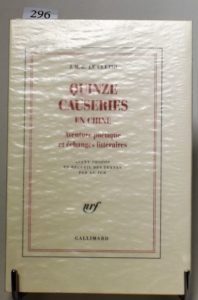 Le CLÉZIO (Jean-Marie Gustave). Quinze causeries en Chine. Aventure poétique et échanges littéraires. Avant-propos par Xu Jun. S. l., Gallimard, n. d. [Paris, 2019]. In-8° broché, couverture rempliée. ÉDITION ORIGINALE. Un des 90 exemplaires du tirage de tête sur vélin rivoli, celui-ci n° 34. EXEMPLAIRE NON COUPÉ à l’ÉTAT de NEUF.