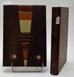 LOUYS (Pierre). Quatorze Images. Paris, Editions Briant-Robert, 1925. In-4°, oasis prune, large décor géométrique mosaïqué de saumon et titre doré ornant le premier plat, dos lisse muet, tête dorée, couverture illustrée en couleurs conservée, chemise à rabats en demi-oasis, étui (M. F. Jordan). 42 lithographies par André DIGNIMONT. Tiré à 554 exemplaires, celui-ci (n° 7), un des 50 hors commerce sur arches, justifié à la main avec envoi de l’éditeur.