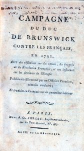 Campagne du Duc de Brunswick contre les Français en 1792, avec des réflexions sur les causes, les progrès de la Révolution française, et son influence sur les destinées de l'Europe. Publiée en allemand par un officier prussien témoin oculaire ; et traduite en français sur la quatrième édition. Paris, A. Cl. Forcet, An III [1795], 8°, 3 parties en un vol., [4]-VIII-343-[1 blanche] p., toile grise à la Bradel moderne, titre doré (bruniss., annotation à l'encre au verso du titre, cach.). Unique édition de ce mémoire étrange, composé sous forme de lettres. Les bibliographes penchent en faveur d'une composition au moins partielle du traducteur, Martial Des Renaudes (1750-1825), une des figures de Talleyrand, qui fut ultérieurement membre du Tribunal et Garde des Archives de la Bibliothèque du Conseil d'Etat.