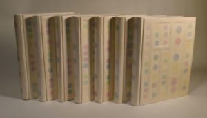 MARTIN du GARD (Roger). Les Thibault. Paris, Éditions de la Nouvelle Revue Française, 1922-1929. 7 volumes in-4° tellière, bradel, vélin ivoire, décor géométrique en relief et semis pastilles de couleurs ornant les plats et le dos, couverture conservée (reliure fin XXe s.). ÉDITIONS ORIGINALES. • I : Les Cahiers gris (1922). 1/898 ex. de tête, celui-ci (n° XVII), 1/108 in-4° tellière sur vergé. • II : Le Pénitencier (1922). 1/898 ex. de tête, celui-ci (n° XVII), 1/108 in-4° tellière sur vergé. • III : La Belle saison (1923, 2 vol.). 1/842 ex. de tête, celui-ci (n° XC), 1/108 in-4° tellière sur vergé. • IV : La Consultation (1928). 1/1370 ex. de tête, celui-ci (non num.), 1/108 in-4° tellière sur vergé. • V : La Sorennila (1928). 1/ 1370 ex. de tête, celui-ci (n° CVIII), 1/122 in-4° tellière sur vergé. • VI : La Mort du père (1929). 1/1365 ex. de tête, celui-ci (non num.), in-4° tellière sur vergé.