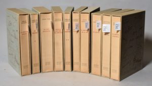 [MEILLEURS ROMANS]. Grand Prix des meilleurs romans du demi-siècle. Paris, André Sauret, 1950-1954. Ensemble 10 volumes in-8°, brochés, étuis de l’éditeur. • BARRÈS. La Colline inspirée. Ill. par Decaris ; • BERNANOS. Journal d’un curé de campagne. Ill. par Mourlot ; • DUHAMEL. Confession de minuit. Ill. par Mann ; • FRANCE. Les Dieux ont soif. Ill. par Van Dongen ; • GIDE. Les Faux monnayeurs. Ill. par Minaux, • GOBINEAU. Les Pléiades (2 vol.). Ill. par Villeboeuf, • HUYSMANS. En route. Ill. par Mahn, • MALRAUX. La Condition humaine. Ill. par Galanis ; • ROMAIN. La Douceur de la vie. Ill. par Heuzè. Tirés à 3400 exemplaires, ceux-ci (n° 1636), sur vélin d’Arches.