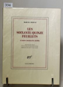 PROUST (Marcel). Les Soixante-quinze feuillets […] Et Autres manuscrits inédits. Préface par Jean-Yves Tadié. S. l., Gallimard, n. d. [2021]. In-8°, broché, non coupé, couverture rempliée. ÉDITION ORIGINALE. Un des 125 exemplaires du tirage de tête sur vélin rivoli, celui-ci n° 36. EXEMPLAIRE NON COUPÉ à l’ÉTAT de NEUF.