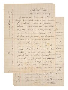 ARTAUD Antonin LETTRE AUTOGRAPHE SIGNÉE À Alain CUNY. Ville Evard, 6 janvier 1940. 4 pages in-8 sur cahier d'écolier (pliure et quelques taches comme souvent). Lettre importante mystique et tourmentée adressée à Alain Cuny. ”Je vous aime beaucoup Alain Cuny mais voilà plus d'une semaine que Marie, mère de Jésus Christ, est redescendue sur terre et qu'elle cherche à me rejoindre ici par tous les moyens et les français qui sont un peuple de démons ne cessent aussi par tous les moyens, au premier rang desquels la magie la plus abominable de Satan... ” ...”la grande et définitive bataille entre le bien et le mal est actuellement engagée et vous ne pouvez plus penser que ce n'est ni vous ni moi qui arrangeront les choses car vous avez vous aussi votre place dans le combat et la dernière... astuce de Satan est de vous faire croire qu'il ne se passe rien dans le réel”.