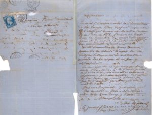 BAUDELAIRE Charles - POULET-MALASSIS Auguste Lettre autographe signée par les deux à Firmin Maillard. 3 pages in-8 avec enveloppe (déchirure et taches sans manque de texte). Poulet-Malassis l'éditeur de Baudelaire reçoit une sommation de Monsieur Leouzou lui demandant de faire disparaître un article qu'il juge désobligeant. A la fin de la lettre signée par Poulet-Malassis (1 page), il indique «Ce n'est pas tout, tournez la page pour la colère de Baudelaire». Baudelaire (2 pages) : «Je serais un homme bien mal appris si je n'acceptais pas sans plaisir tout ce que vous dites de flatteur sur mon compte» ... «Je ne suis pas aussi répugnant que le Figaro a essayé de le persuader. Quand à l'anecdote des noix et des cervelles d'enfant que j'ai déjà lue quelque part, elle est une invention joviale de mon ami Foray, peintre et élève de Delacroix» «On m'a montré à moi-même une fois un Mr Baudelaire qui était fort désagréable et cette confusion n'avait rien de réjouissant pour ma vanité» ... Exceptionnel.