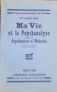 FREUD Sigmund MA VIE ET LA PSYCHANALYSE suivi de Psychanalyse et Médecine. Paris, Gallimard, Les documents bleus, 1928. In-12, broché. Édition originale française traduite de l'allemand par Marie Bonaparte. Un des 65 exemplaires numérotés sur vélin pur fil, seul beau papier. Bel exemplaire