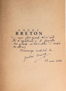 GRACQ Julien. André Breton. José Corti, 1948. In-12, broché (papier jauni comme souvent). Édition originale illustrée en frontispice du portrait de Breton par Hans Bellmer. Texte autographe de Gracq sous le faux titre : «Mon plus grand désir eût été d'appartenir à la famille des grands indésirables» (André Breton). Hommage cordial de Julien Gracq, 18 mars 1989.»