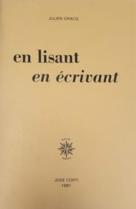 GRACQ Julien En lisant en écrivant. José Corti, 1980. In-12 broché, non coupé. Edition originale. Un des 200 exemplaires signés par José Corti.