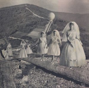 HUGNET Georges LES MARIÉES. COLLAGE ORIGINAL SIGNÉ. 1961. 25,3 x 25,5 cm sous passepartout. Collage original daté et monogrammé au recto par Georges Hugnet représentant des jeunes femmes défilant en tenue de mariée.