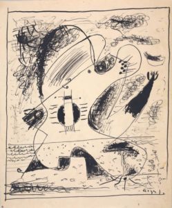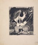 JORN Asger [Dag tyv] ce qui vole le jour. DESSIN ORIGINAL À L'ENCRE DE CHINE DOUBLE FACE SIGNÉ sur papier fort. 23,5 x 19,4 cm. Au recto, le dessin, 20,8 x 18, 2cm est signé Asger j en bas à droite Au verso, dessin de facture érotique 14,3 x 12, 2 cm non signé (légères traces de colle), annoté au crayon 9257 en bas à droite. Reproduit dans Asger Jorn Dessins Silkeborg Kunstmuseum 1979, photo du recto page 30, notes des dessins 1937-1947 par Troels Andersen. Variantes du verso dans Asger Jorns tegninger Silkeborg Kunstmuseum 1983 p50, 51 Ancienne collection Noël Arnaud