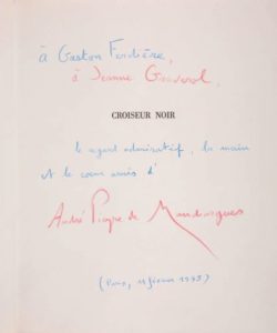 LAM Wifredo. PIEYRE DE MANDIARGUES André LE CROISEUR NOIR. Paris, Collection Paroles peintes, 1972. In-folio en feuilles, couverture imprimée, chemise et étui toilés de l'édition. Edition originale illustrée de 6 planches gravées à l'eau-forte par Wifredo Lam. Tirage limité à 150 exemplaires numérotés signés à la justification par André Pieyre de Mandiargues et Wifredo Lam. Un des 15 exemplaires sur vélin d'Arches réservés aux collaborateurs comportant une suite des 6 gravures, toutes signées par Wifredo Lam. Bel envoi autographe à pleine page au crayon bleu et rouge : «à Gaston Ferdière à Jeanne Graverol le regard admiratif la main et le cœur amis d'André Pieyre de Mandiargues Paris 11 février 1975». L'un des plus beaux livres illustrés par Wifredo Lam.
