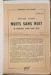 LEIRIS Michel Nuits sans nuit, NRF, Gallimard, 1961. In-12, broché. Edition en partie originale. …
