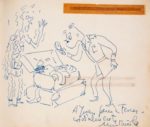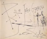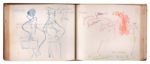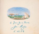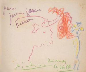 LIVRE D'OR de Juan Garcia Ferrer, Directeur de la Douane de La Junquera. 1953-1957. Album in-8 oblong, basane maroquinée grenat, frise dorée sur le premier plat, dos titré or, tranches dorées. 122 pages de dédicaces, certaines accompagnées de dessins. 16,5 x 19,5 cm Remarquable Livre d'or ayant appartenu au directeur de la Douane de la Junquera, Juan Garcia Ferrer dans les années 1950. Il comporte environ 140 signatures ou dédicaces de personnalités politiques, acteurs et actrices, réalisateurs de théâtre et de cinéma internationaux (Sophia Loren, David Niven, Gene Kelly, Robert Mitchum, Vera Clouzot, Roberto Rossellini et Ingrid Bergman, Fernandel...), musiciens et chanteurs (Luis Mariano, Trenet, Cole Porter), sportifs (Louison Bobet), toreadors (Luis Miguel Dominguin, Rafael Albaicin), illustrateurs ou peintres (Jean Godebski : scène de tauromachie, Jean Hugo : dessin ovale au pastel (5 x 9,5 cm) représentant une maison au bord de la mer, daté 6. VI.54), écrivains (Somerset Maugham) etc. Certaines des dédicaces sont accompagnées de dessins, dont les plus remarquables sont : Un dessin original de Pablo PICASSO à pleine page aux crayons de couleurs représentant une scène de tauromachie, dédicacé en violet «paraJuan Garcia Ferrer» et signé, et daté en vert : «Picasso Nîmes le 6.6.54». 15,5 x 18,7 cm Un dessin original à pleine page de Salvador DALI à l'encre représentant Don Quichotte et Sancho Panza, dédicacé «Para Juan Garcia», signé et daté Dali 1952. 15,5 x 18,7 cm Ce livre d'or a été exposé à l'IVAM (Institut Valencia d'Art Modern) du 17/05/2005 au 28/08/2005, pour l'exposition DALI (El Quijote), sous le n°44. Provenance : Collection Enrique Sabater, puis Collection particulière