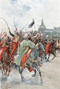 Récits de guerre. Souvenirs (1803-1814). Dessins de F. de Myrbach, H. Duprey, Walker, L. Sergent, M. Roy. Introd. par Fr. Masson. P., Boussod, Valadon et Cie, 1892, gd 4° (35 x 28 cm), XIII-168 p., riche iconographie en noir et couleurs, demi-chagrin rouge à coins, dos titré à 5 nerfs, tête dorée. "A côté d'aventures galantes et d'exploits individuels, on retiendra le récit de la mort du prince Louis de Prusse à Saalfeld, une évocation de la campagne de 1809 et une narration de la bataille de Leipzig. L'ouvrage s'achève en 1814 sur les adieux de Fontainebleau. Populaire comme ceux de Marbot, ces mémoires d'un officier de cavalerie légère rédigés avec bonheur méritent leur réputation " (Tulard, 1117).