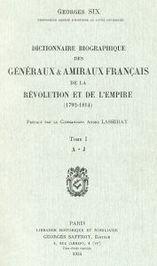 Dictionnaire biographique des généraux et amiraux français de la Révolution et de l'Empire (1792-1814). P., G. Saffroy, 1934 [réimpression : 1974], 2 vol. 8°, 588, 614 p., bradel pleine toile verte, dos lisses, pièces de titre et de tomaison en basane rouge, couv. cons.