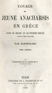 Voyage du jeune Anacharsis en Grèce dans le milieu du quatrième siècle avant l'ère vulgaire. P., Hachette, 1860, 3 vol. in-12, demi-basane noire, dos lisses ornés de motifs dorés en long, titre et tomaison dorés, plat supér. du t. 1 décoré d'un médaillon doré du Lycée impérial du Puy, plats décorés de motifs à froid bordés d'un filet doré, tranches marbrées, étiquette de prix au contreplat du t. 1 (coiffes et coins frottés, un coin écorné au t. 1, qq. rouss.).