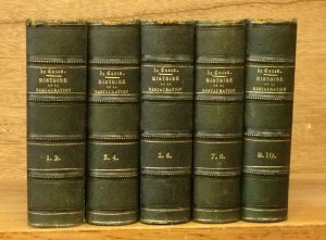 Histoire de la Restauration et des causes qui ont amené la chute de la branche aînée des Bourbons. Par un Homme d'Etat. Brux., Hauman et Cie, 1831, 10 tomes in-12 reliés en 5 vol., demi-chagrin vert du 19e s., dos à 4 nerfs, auteur, titre, tomaison, filets et pointillés dorés (coiffes supér. frottées, lég. rousseurs). Ouvrage erronément attribué au duc de Cazes, ministre et chef de la police sous Louis XVIII.