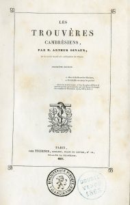 Les Trouvères, jongleurs et ménestrels du Nord de la France et du midi de la Belgique. 1. Les Trouvères cambrésiens. 3e édition. 2. Les Trouvères de la Flandre et du Tournaisis. 3. Les Trouvères artésiens. P., Téchener, 1837-1843, 3 vol. 8°, [2]-193, [VIII]-374, [VII]-483 p., 1 gravure, Idemi-basane noire à coins, dos à 4 nerfs plats, roulette dorée sur les nerfs, titres, fleurons, filets et roulettes dorés (coiffes, pieds de dos, coins et mors frottés, manque au mors supér. du t. 2, cachets à la p. de titre, rousseurs). Sans le vol. 4. : Les Trouvères brabançons, hainuyers, liégeois et namurois.
