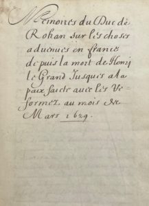 [MANUSCRIT]. ROHAN (Henri de) — Mémoires du duc de Rohan sur les choses advenues en France depuis la mort de Henri le Grand jusques à la paix faicte avec les Réformez au mois de mars 1629. – [Suivi de :] Mémoires du duc de Rohan sur la guerre de la Valteline.