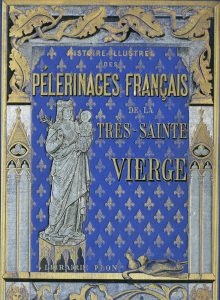 Histoire illustrée de la très sainte vierge. Enrichi de 450 dessins inédits par Hubert-Clerget et accompagné de 20 cartes des pèlerinages de la très sainte vierge en France. P., Plon, 1890, 4°, 1272 p., cartonnage polychrome éditeur, pleine toile bleue, dos et 1er plat entièrement ornés de motifs dorés et argentés, tranches dorées (plaque de A. Souze). Bel ex. très frais.