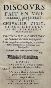 Kenelm Digby (1603-1665) prononça ce curieux discours sur la poudre de sympathie qu’il avait mise au point alors qu'il était en résidence en France, à Montpellier, en 1657. Composé en français, l’ouvrage parut à Paris avant d'être traduit en anglais et publié à Londres la même année. Il acquit à son auteur une importante renommée et connut de nombreuses éditions en français, anglais, néerlandais et latin.