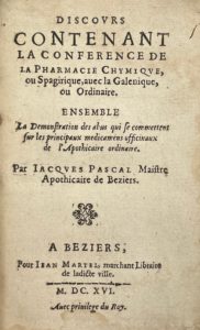 PASCAL (Jacques) — Discours contenant la conférence de la pharmacie chymique ou spagirique, avec la galenique ou ordinaire.