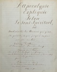 C'est dans cette ville qu'il fit paraître, de 1855 à 1859, les sept volumes de sa traduction d'Apocalypsis revelata (1766), dont le présent manuscrit ne reprend que les deux premiers, c'est-à-dire le commentaire des chapitres I à VI de l'Apocalypse.