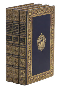 Paris, Renouard, 1809. 6 parties en 3 volumes in-8, maroquin bleu nuit à long grain, large bordure de cygnes, palmettes et urnes dorée, emblème doré au centre, dos orné, dentelle intérieure, tranches dorées (Canape).Belle édition publiée par l'éditeur bibliophile Antoine-Augustin Renouard, selon lequel « il serait difficile de concevoir un livre plus élégant et dont les ornements fussent disposés avec plus de profusion et d'agrément » (Cohen).