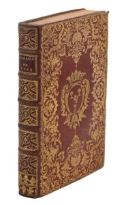 Paris, Le Breton, [1778]. In-8, maroquin rouge, large plaque dorée à la Dubuisson, armoiries au centre, dos orné de fleurs de lis, dentelle intérieure, doublure et gardes de soie bleue, tranches dorées (Reliure de l'époque).Exemplaire en maroquin à la Dubuisson aux armes de la famille Le Bas du Plessis ou Le Bas de Girangy. Un Almanach royal pour 1764 relié aux mêmes armes figurait dans la bibliothèque Galard de Béarn (1920, I, n°297).