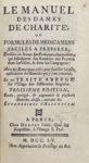 Paris, Debure l'aîné, 1755. In-12, veau marbré, dos orné, tranches marbrées (Reliure de l'époque).Troisième édition, revue, corrigée et augmentée de remèdes choisis extraits des Éphémérides d'Allemagne. Elle est suivie d'un Traité de la saignée par Étienne Chardon de Courcelles, médecin de la marine à Brest. La première édition de ce manuel est de 1747 ; la dernière de 1816. Celle-ci est ornée d'un frontispice gravé non signé.