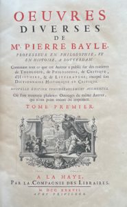 La Haye, par la Compagnie des libraires, 1737. 4 volumes in-folio, veau fauve, dos orné, tranches rouges (Reliure de l'époque).Les Œuvres diverses de Bayle, éditées par Des Maizeaux, contiennent « tout ce que cet auteur a publié sur des matières de théologie, de philosophie, de critique, d'histoire et de littérature, excepté son Dictionnaire historique et critique ». Cette édition est préférable à celle de 1727-1731, selon Brunet, parce qu'elle contient, à la fin du premier tome, cent cinquante Lettres de Bayle à sa famille qui ne se trouvaient pas dans la première.