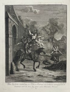Liège, Bassompierre, 1776. In-4, veau marbré, dos orné, tranches rouges (Reliure de l'époque).Second tirage de cette célèbre illustration composée de 31 figures hors texte d'après les compositions de Charles-Antoine Coypel, peintes entre 1715 et 1734, et les dessins de Cochin, Trémolières, Boucher et Lebas, gravées par van Schley, Picart, Fokke et Tanjé. Cette illustration avait d'abord paru à La Haye en 1746 avec la même version abrégée du texte de Cervantes.