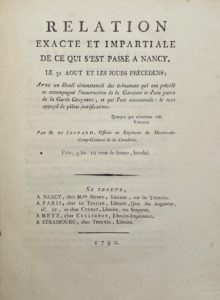 LÉONARD (M. de) — Relation exacte et impartiale de ce qui s'est passé à Nancy, le 31 août et les jours précédens. Avec un détail circonstancié des événemens qui ont précédé et accompagné l'insurrection de la Garnison et d'une partie de la Garde Citoyenne, et qui l'ont occasionnée : le tout appuyé de pièces justificatives. Nancy, Paris, Metz, Strasbourg, Mme Henry, e.a.,