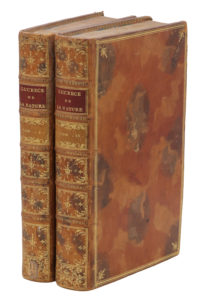 Paris, Bleuet, 1768. 2 volumes in-8, veau porphyre, triple filet doré avec fleurons aux angles, dos orné, dentelle intérieure, tranches dorées (Reliure de l'époque).Édition originale de la traduction en prose de Lagrange, révisée par Naigeon et accompagnée du texte latin du poème philosophique de Lucrèce.
